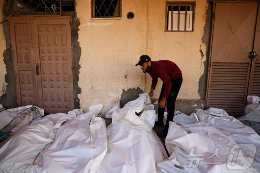 20일(현지시간) 가자지구 중부 데이르 엘발라에 있는 알아크사 순교자 병원에서 이스라엘의 공습으로 사망한 팔레스타인인들의 시신 사이에 한 남성이 서 있다. ⓒ AFP=뉴스1 ⓒ News1 권영미 기자 |