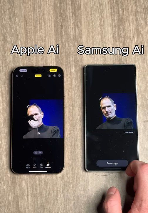 이 유튜버는 팔이 얼굴을 가린 스티브 잡스의 사진으로 두 제품의 AI 지우개 기능을 썼다. 삼성전자의 AI 기능은 얼굴을 가린 팔과 스마트폰을 성공적으로 지웠다. 하지만 애플의 AI는 팔 부분을 제대로 지우지 못하고 얼굴 부분이 뭉그러진 결과물을 내놨다.
