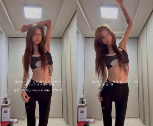 이어 함께 공개된 영상 속에서 최준희는 자신의 몸매를 담았다. 브라톱에 레깅스를 입은 최준희는 지방은 전혀 보이지 않는 앙상한 팔다리로 시선을 끈다.