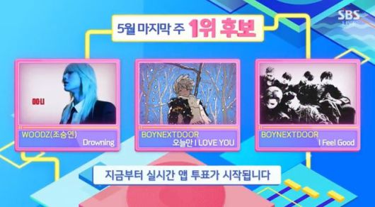 보이넥스트도어는 신곡 ‘I Feel Good’과 지난 1월 발표한 싱글 ‘오늘만 I LOVE YOU’ 2곡을 1위 후보에 올려 인기를 입증했다.