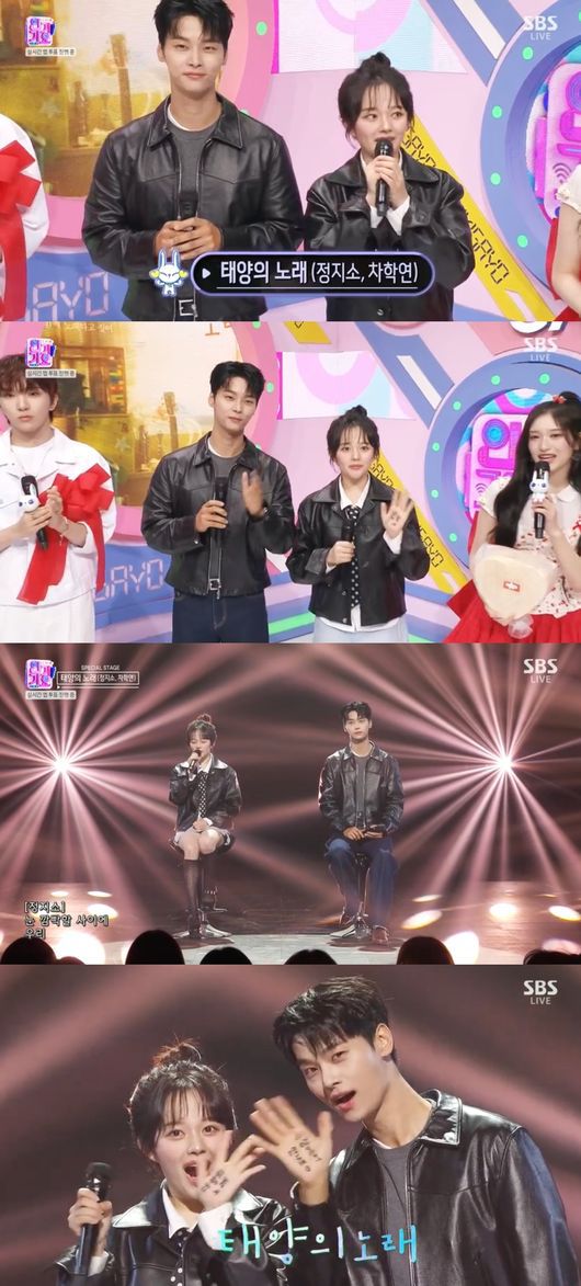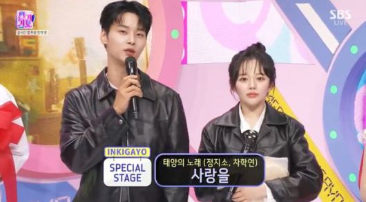 25일 오후 방송된 SBS ‘인기가요’에서는 영화 ‘태양의 노래’의 주역 차학연과 정지소가 출연해 ‘사랑을’ 무대를 꾸몄다.