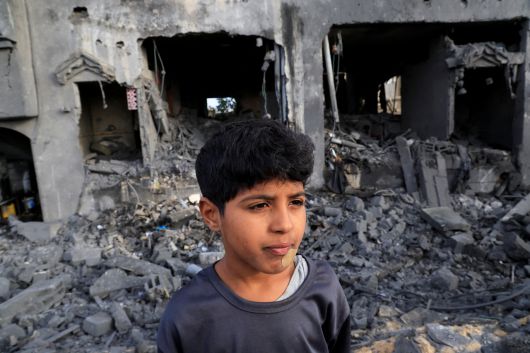 15일(현지시간) 가자지구 남부 칸 유니스에서 한 남자 아이가 이스라엘의 주택 공격 현장한가운데 서 있는 모습. 사진은 기사 내용과 무관 [로이터] |