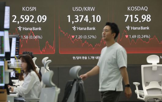 23일 서울 중구 하나은행 딜링룸 현황판에 코스피·코스닥 지수 종가가 표시돼있다. 연합뉴스 |