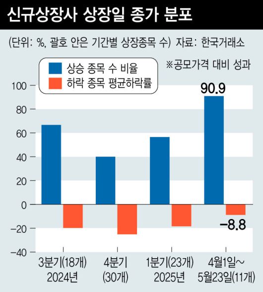 신규 상장 종목의 상장 첫날 주가가 상승으로 돌아서기 시작한 것은 2월 중순부터다. 2월10일 상장한 아이에스티이가 97.4% 상승한 것을 시작으로, 5월23일까지 26개 상장종목 가운데 4개 종목만 하락하고 나머지는 모두 상승했다. 4개 하락 종목 가운데도 10% 넘게 떨어진 종목은 더즌(10.2%) 하나뿐이었다.