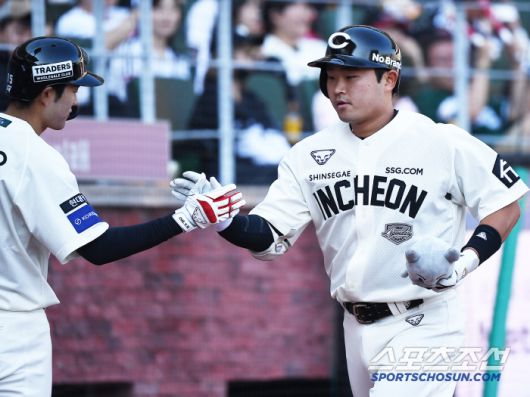 25일 인천 SSG랜더스필드에서 열린 LG-SSG전. 9회말 1사 신범수가 솔로포를 친 후 환영받고 있다. 인천=정재근 기자 cjg@sportschosun.com/2025.5.25/