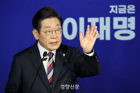 이재명 더불어민주당 대선 후보가 25일 서울 여의도 민주당사에서 기자회견을 하고 있다. 박민규 선임기자 |