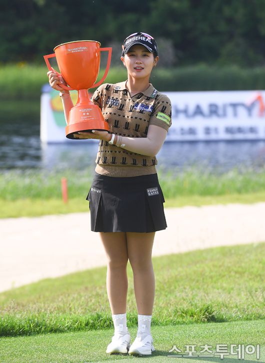 [여주(경기)=스포츠투데이 팽현준 기자] 25일 경기 여주시 페럼클럽CC에서 열린 2025 KLPGA '제13회 E1 채리티 오픈' 최종라운드, 최종합계 16언더파로 우승을 차지한 박현경이 포즈를 취하고 있다. 2025.05.25. [스포츠투데이 팽현준 기자 sports@stoo.com]