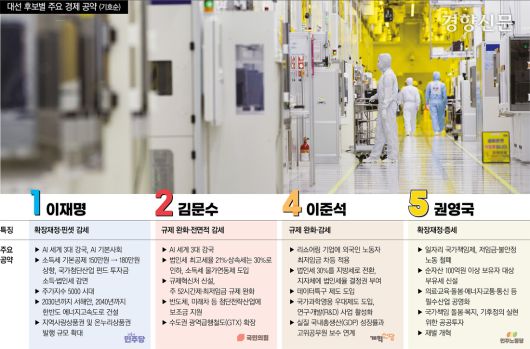 이준석 개혁신당 후보도 경제성장을 위한 규제 철폐와 감세를 약속했다. 국무총리 산하 규제심판원을 신설해 신청부터 특례 부여까지 원스톱 규제 완화를 공약했다. 또 외국에서 국내로 돌아온 리쇼어링 기업에는 10년간 외국인 노동자 최저임금 차등 적용을 허용하겠다고 했다. 글로벌 디지털 자산 유치를 위한 ‘데이터 특구’를 도입해 입주 기업에 법인세 감면 등 혜택을 주겠다고 약속했다.