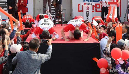 [홍성=뉴스핌] 최지환 기자 = 김문수 국민의힘 대선 후보가 25일 오후 충남 홍성군 홍성천 복개주차장에서 열린 “기적으로 만들 진짜 홍성” 집중유세에서 유권자들에게 큰절을 하고 있다. 2025.05.25 choipix16@newspim.com