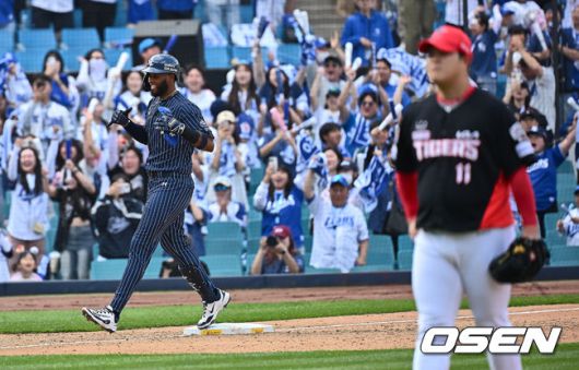 [OSEN=대구, 이석우 기자] 25일 대구삼성라이온즈파크에서 2025 신한 SOL 뱅크 KBO 리그 삼성 라이온즈와 KIA 타이거즈의 경기가 열렸다. 홈팀 삼성은 원태인이, 방문팀 KIA는 윤영철이 선발 출전했다. 삼성 라이온즈 디아즈가 9회말 끝내기 홈런을 치고 세리머니를 하고 있다. 2025.05.25 / foto0307@osen.co.kr