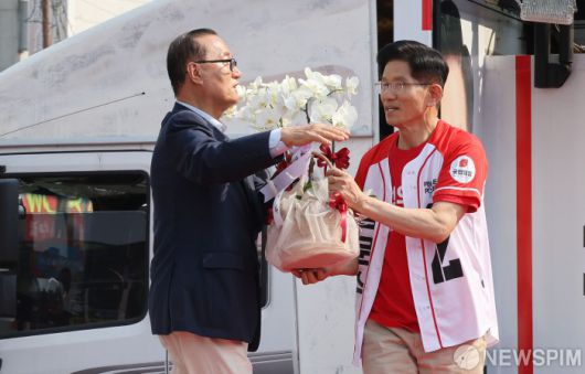[홍성=뉴스핌] 최지환 기자 = 김문수 국민의힘 대선 후보가 25일 오후 충남 홍성군 홍성천 복개주차장에서 열린 “기적으로 만들 진짜 홍성” 집중유세에서 지지자로부터 꽃을 선물 받고 있다. 2025.05.25 choipix16@newspim.com
