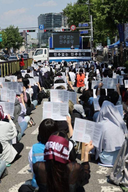 동덕여대 재학생 모임인 '민주 없는 민주동덕'은 25일 오후 서울 종로구 서울경찰청 인근에서 집회를 열어 교내 점거 농성을 벌인 학생들에 대한 수사 중단을 촉구했다.