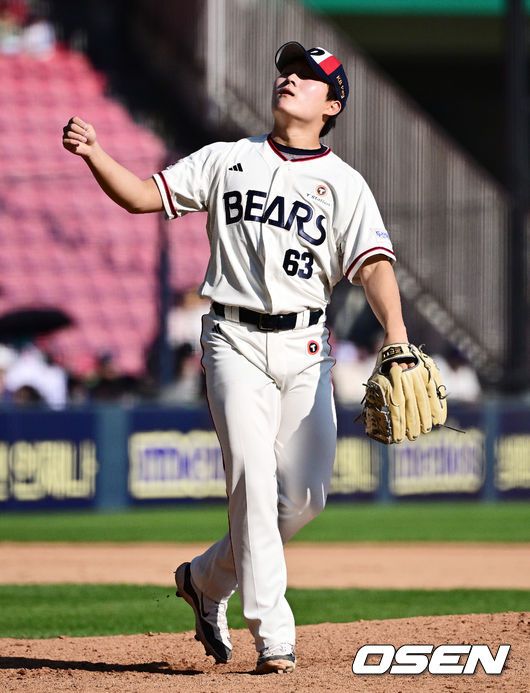 [OSEN=잠실, 지형준 기자] 25일 서울 잠실구장에서 2025 신한 SOL Bank KBO리그 두산 베어스와 NC 다이노스의 경기가 열렸다. 이날 두산은 잭로그, 콜어빈, NC는 최성용을 선발로 내세웠다. 8회초 2사에서 두산 김택연이 NC 김휘집의 2루 플라이 타구를 바라보고 있다. 2025.05.25 /jpnews@osen.co.kr
