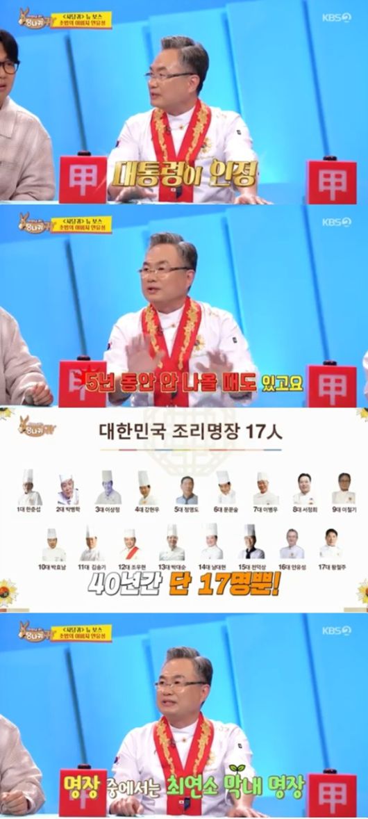안유성은 MC들이 "명장은 누가 인정해주는 거냐"고 궁금해 하자 "대통령으로 나라에서 지정한다. 5년 동안 안 나올 때도 있다. 40년 간 17명 뿐이다"라고 설명했다.