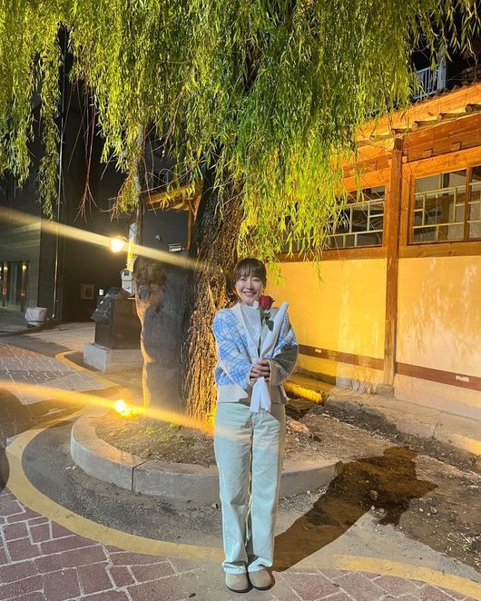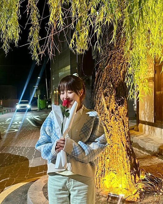 공개된 사진 속 엄지원은 아름다운 나무 아래에서 장미꽃을 들고 수줍은 미소를 짓고 있다. 고백을 받은 듯 설렘 가득한 미소를 짓고 있는 엄지원은 “오늘부터 1일”이라며 열애를 고백했다.