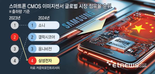 시장조사업체 카운터포인트리서치에 따르면 지난해 출하량 기준 삼성전자의 CIS 점유율 순위가 전년도 2위에서 4위로 하락했다.