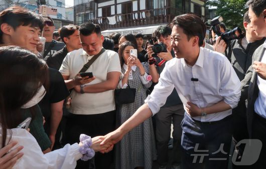 (서울=뉴스1) 허경 기자 = 이준석 개혁신당 대통령 후보가 25일 서울 종로구 서순라길을 찾아 유권자들과 인사하며 지지를 호소하고 있다. 2025.5.25/뉴스1