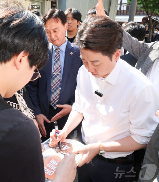 (서울=뉴스1) 허경 기자 = 이준석 개혁신당 대통령 후보가 25일 서울 종로구 서순라길을 찾아 유권자들과 인사하며 지지를 호소하고 있다. 2025.5.25/뉴스1