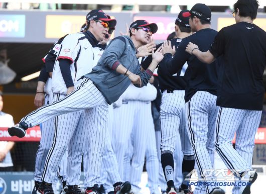 25일 인천 SSG랜더스필드에서 열린 LG-SSG전. LG가 9대3으로 승리했다. 염경엽 감독이 선수들과 하이파이브하고 있다. 인천=정재근 기자 cjg@sportschosun.com/2025.5.25/