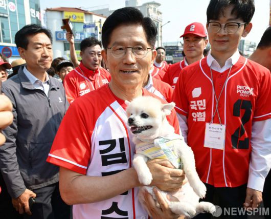 [홍성=뉴스핌] 최지환 기자 = 김문수 국민의힘 대선 후보가 25일 충남 홍성군 홍성읍 내포로에서 열린 유세에서 강아지를 안아보고 있다. 2025.05.25 choipix16@newspim.com