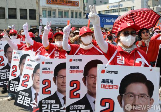 [홍성=뉴스핌] 최지환 기자 = 김문수 국민의힘 대선 후보 선거운동원들이 25일 충남 홍성군 홍성읍 내포로에서 열린 유세에서 지지를 호소하고 있다. 2025.05.25 choipix16@newspim.com