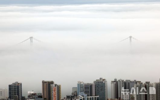[부산=뉴시스] 하경민 기자 = 초여름 더위가 이어진 21일 부산 황령산의 한 전망대에서 내려다 본 도심이 짙은 해무로 뒤덮여 장관을 연출하고 있다. 2025.05.21. yulnetphoto@newsis.com |
