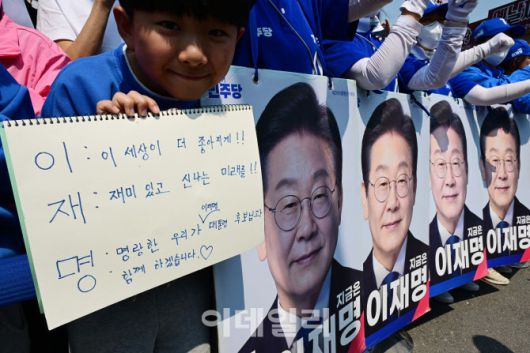 [이데일리 노진환 기자] 이재명 더불어민주당 대통령 후보가 캐스팅보트인 충청권 공략에 나선 25일 충남 당진전통시장에서 어린이들이 이재명 삼행시를 선보이고 있다.