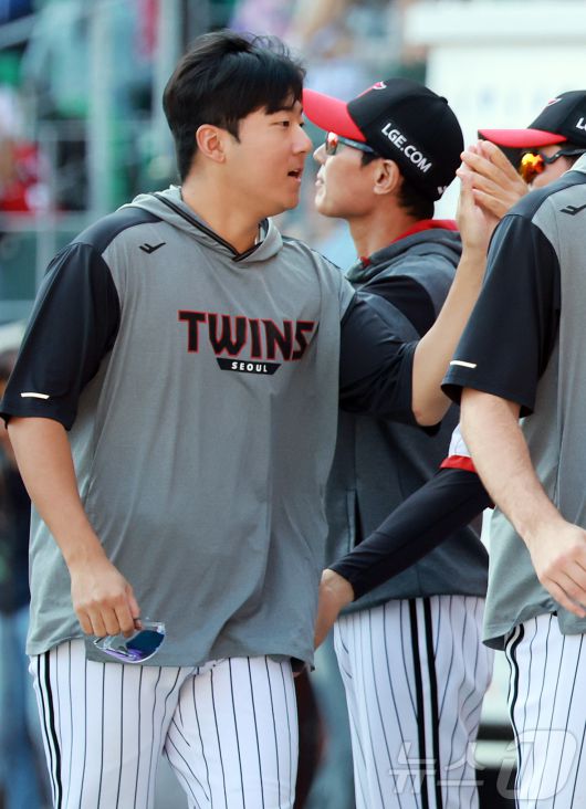 (인천=뉴스1) 김진환 기자 = 25일 오후 인천SSG 랜더스필드에서 열린 '2025 신한 SOL뱅크 KBO리그' LG 트윈스와 SSG 랜더스의 경기에서 9대3 승리를 거둔 LG 송승기가 염경엽 감독을 비롯한 코칭스테프와 하이파이브를 하고 있다. 2025.5.25/뉴스1