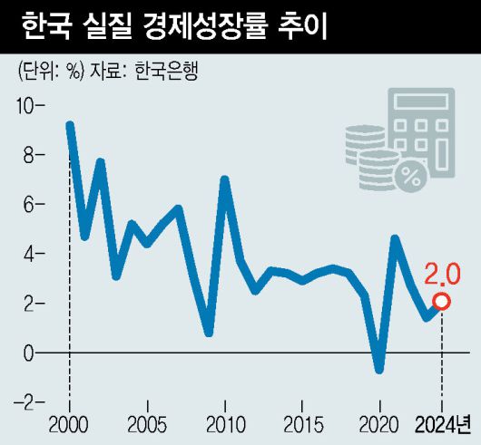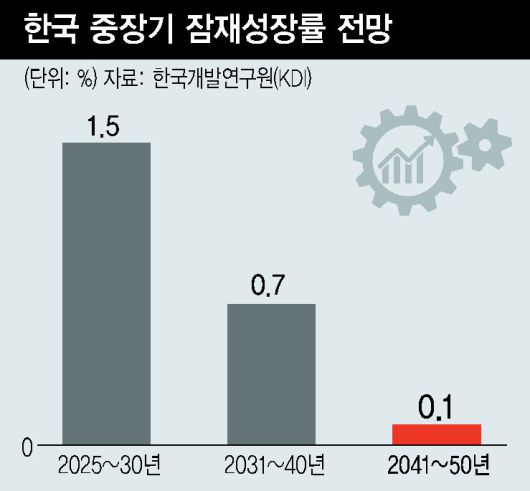 실제 한국개발연구원은 이번에도 수정 경제전망을 내놓기 일주일 전인 지난 8일 잠재성장률 하락에 대한 경고음을 울렸다. 향후 5년간 평균 잠재성장률은 1.5%로, 3년 전 제시한 전망 값보다 0.4%포인트 하락할 것이라는 게 연구원의 추정이었다. 2040년대에는 우리 경제가 수축(마이너스 성장)할 수 있다는 전망도 덧붙였다. 이는 우리 경제가 0~1%대 저성장이 상시화되는 구조적 국면에 들어섰다는 얘기다.