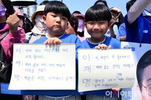 아시아투데이 (당진) 이병화 기자 = 이재명 더불어민주당 대통령 후보가 캐스팅보트인 충청권 공략에 나선 25일 충남 당진전통시장에서 어린이들이 이재명 삼행시를 선보이고 있다. |