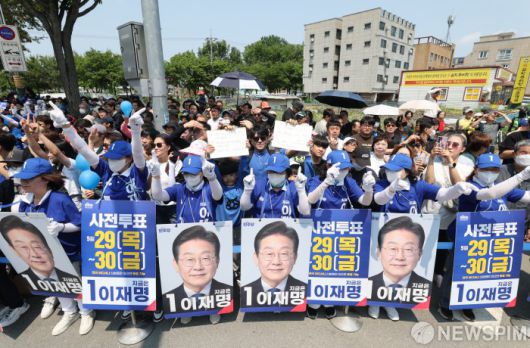[당진=뉴스핌] 김학선 기자 = 이재명 더불어민주당 대선 후보 선거운동원들이 25일 충남 당진시 당진전통시장 앞 유세장에서 이 후보 지지 및 사전투표를 독려하고 있다. 2025.05.25 yooksa@newspim.com |