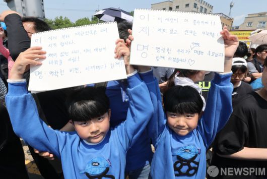 [당진=뉴스핌] 김학선 기자 = 25일 충남 당진시 당진전통시장 앞 이재명 더불어민주당 대선 후보의 유세장을 찾은 쌍둥이 어린이들이 이재명으로 삼행시를 적어 들어보이고 있다. 2025.05.25 yooksa@newspim.com