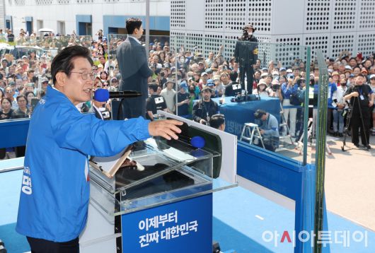 아시아투데이 (당진) 이병화 기자 = 이재명 더불어민주당 대통령 후보가 캐스팅보트인 충청권 공략에 나선 25일 충남 당진전통시장을 찾아 지지를 호소하고 있다.
