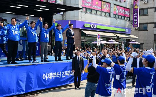 아시아투데이 (당진) 이병화 기자 = 이재명 더불어민주당 대통령 후보가 캐스팅보트인 충청권 공략에 나선 25일 충남 당진전통시장을 찾아 지지를 호소하고 있다.