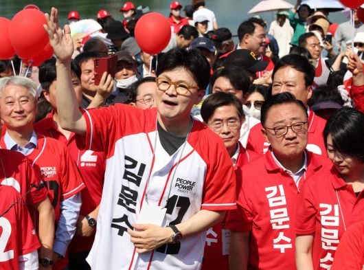 한동훈 전 국민의힘 대표가 25일 서울 송파구 석촌호수에서 김문수 국민의힘 대선 후보 지지를 호소하고 있다. 2025.05.25. 뉴시스 |