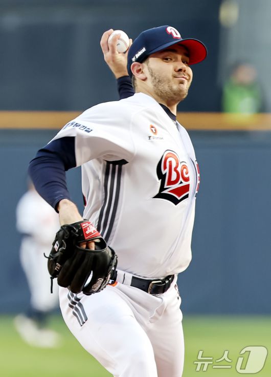 10일 오후 서울 송파구 잠실야구장에서 열린 '2025 신한 SOL뱅크 KBO 리그' 한화 이글스와 두산 베어스의 경기에서 1회초 두산 선발 잭로그가 역투하고 있다. 2025.4.10/뉴스1 ⓒ News1 민경석 기자 |