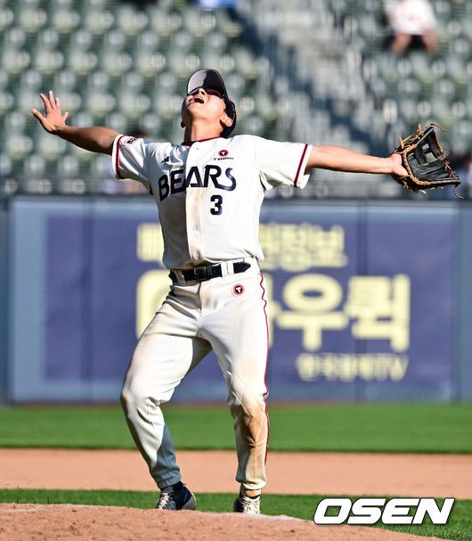 9회초 2사에서 두산 임종성이 NC 김주원의 3루 플라이 타구를 처리하며 미소짓고 있다. 2025.05.25 /jpnews@osen.co.kr