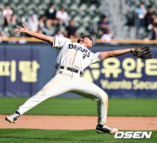 [OSEN=잠실, 지형준 기자] 25일 서울 잠실구장에서 2025 신한 SOL Bank KBO리그 두산 베어스와 NC 다이노스의 경기가 열렸다. 이날 두산이 5-3 승리를 거두며 NC에 시즌 첫 승을 거뒀다. 9회초 2사에서 두산 임종성이 NC 김주원의 3루 플라이 타구를 처리하며 미소짓고 있다. 2025.05.25 /jpnews@osen.co.kr