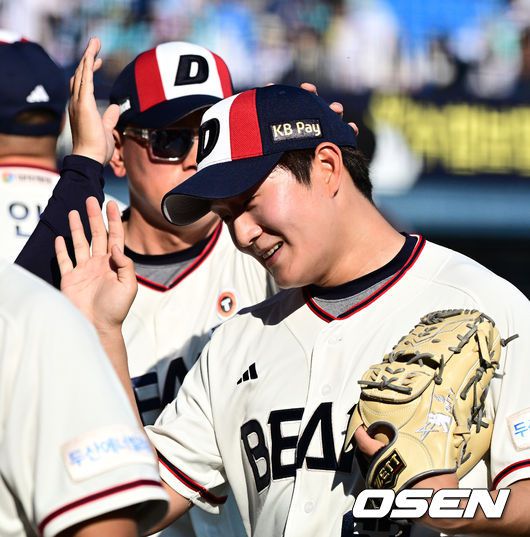 [OSEN=잠실, 지형준 기자] 25일 서울 잠실구장에서 2025 신한 SOL Bank KBO리그 두산 베어스와 NC 다이노스의 경기가 열렸다. 이날 두산이 5-3 승리를 거두며 NC에 시즌 첫 승을 거뒀다. 경기를 마치고 두산 박정배 코치가 김택연과 승리를 기뻐하고 있다. 2025.05.25 /jpnews@osen.co.kr