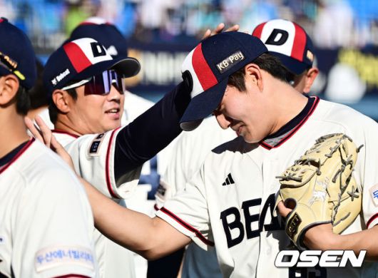 [OSEN=잠실, 지형준 기자] 25일 서울 잠실구장에서 2025 신한 SOL Bank KBO리그 두산 베어스와 NC 다이노스의 경기가 열렸다. 이날 두산이 5-3 승리를 거두며 NC에 시즌 첫 승을 거뒀다. 경기를 마치고 두산 김지용 코치가 김택연과 승리를 기뻐하고 있다. 2025.05.25 /jpnews@osen.co.kr