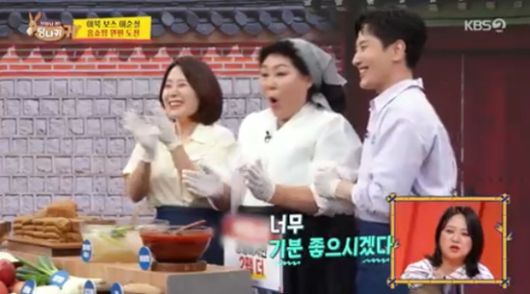 이순실은 대기실에서 비빔냉면, 물냉면, 만두를 맛있게 먹어보는 연습을 했다.