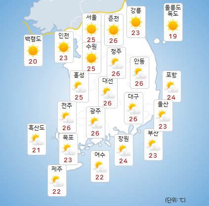낮 최고기온은 △서울 25도 △인천 23도 △수원 25도 △춘천 26도 △대전 26도 △전주 26도 △광주 26도 △대구 26도 △부산 23도 △제주 22도다.