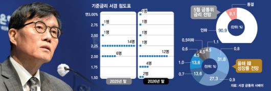 서울경제신문이 25일 국내 이코노미스트 22명을 대상으로 실시한 ‘서경 금통위 서베이’에 따르면 응답자의 91.9%는 한은이 29일 열리는 통화정책방향회의에서 기준금리를 연 2.75%에서 2.50%로 낮출 것이라고 답했다. 금리를 동결할 것이라고 응답한 비율은 9.1%에 그쳤다.