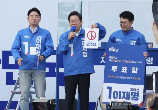 (아산=뉴스1) 안은나 기자 = 이재명 더불어민주당 대통령 후보가 캐스팅보트인 충청권 공략에 나선 25일 오후 충남 아산시 탕정역 한들물빛공원을 찾아 사전투표지를 투표함에 넣는 퍼포먼스를 하고 있다. (공동취재) 2025.5.25/뉴스1