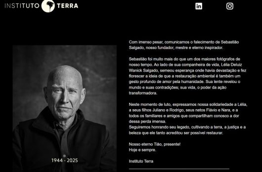 세바스치앙 살가두는 1998년 아내 렐리아와 함께 환경 복원 비영리 단체 인스티투토 테라(Instituto Terra, 대지의 연구소)를 설립했다. 사진은 인스티투토 테라 첫 화면에 오른 부고 소식이다. 인스티투토 테라 화면 갈무리 |