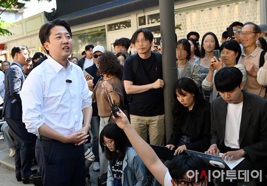 아시아투데이 박성일 기자 = 이준석 개혁신당 대선 후보가 25일 오후 서울 종로구 서순라길 유세 전 발언하고 있다.
