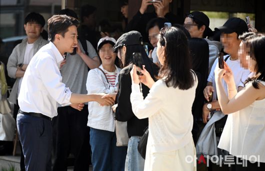 아시아투데이 박성일 기자 = 이준석 개혁신당 대선 후보가 25일 오후 서울 종로구 서순라길 유세에서 시민들과 인사를 나누고 있다.