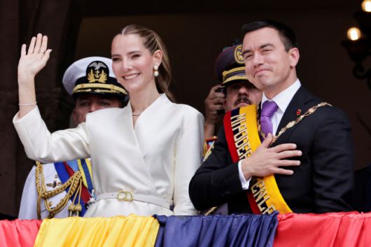 다니엘 노보아 에콰도르 대통령(오른쪽)이 24일(현지시간) 에콰도르 키토의 대통령궁에서 취임식 후 아내 라비니아 발보네시와 함께 시민들에게 인사하고 있다./로이터 연합 |