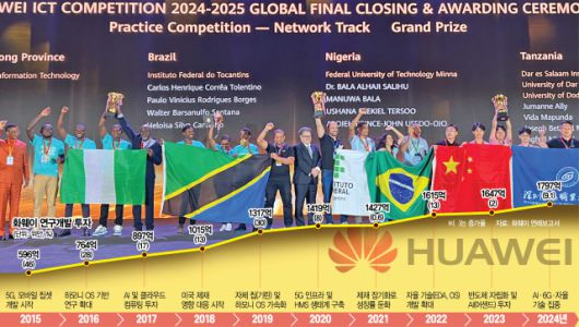 24일 선전 샹그릴라호텔에서 열린 화웨이의 ‘2024~2025 정보통신기술(ICT) 경진대회’는 전 세계 48개 국가와 지역에서 결승 라운드에 참여한 179개 팀의 학생과 교수들로 장사진을 이뤘다. 화웨이가 2015년 중국 학생을 대상으로 시작한 ICT 경진대회는 이듬해부터 글로벌로 확장돼 올해는 참가 국가와 지역이 100여 개로 늘었고 2000여 개 대학에서 21만여 명의 학생과 교수들이 참여했다. 이들은 인공지능(AI)을 활용해 네트워크, 클라우드, 컴퓨팅 트랙 등 최첨단 기술 분야에서 8시간에 걸친 종합 평가를 수행해야 한다. 분야별 수상자들은 호명될 때마다 올림픽에서 메달을 딴 것처럼 환호하며 국기를 흔들었다.