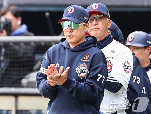 27일 서울 송파구 잠실야구장에서 열린 프로야구 '2025 신한 SOL 뱅크 KBO리그' 롯데 자이언츠와 두산 베어스의 경기, 두산 이승엽 감독이 13대4 승리 후 선수들을 격려하고 있다. 2025.4.27/뉴스1 ⓒ News1 김도우 기자 |